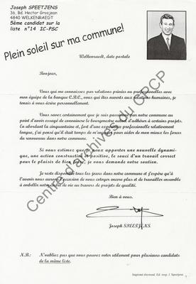Imprimé électoral du candidat du Nouveau PSC de Welkenraedt Joseph Speetjens réalisé à l'occasion des élections communales et provinciales du 8 octobre 2000.