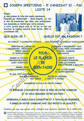 Imprimé électoral du candidat du Nouveau PSC de Welkenraedt Joseph Speetjens réalisé à l'occasion des élections communales et provinciales du 8 octobre 2000.