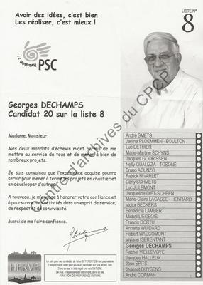 Imprimé électoral du candidat du Nouveau PSC de Herve Georges Dechamps réalisé à l'occasion des élections communales et provinciales du 8 octobre 2000.