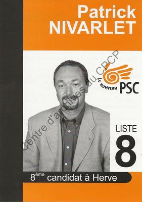 Imprimé électoral du candidat du Nouveau PSC de Herve Patrick Nivarlet réalisé à l'occasion des élections communales et provinciales du 8 octobre 2000.