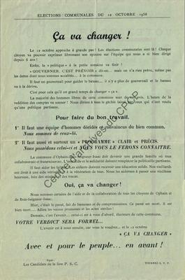 Imprimé électoral de la liste PSC de la commune de Ophain-Bois-Seigneur-Isaac réalisé à l'occasion des élections communales du 12 octobre 1958.
