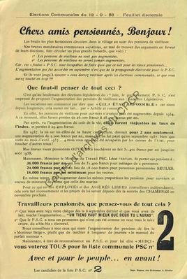 Imprimé électoral de la liste PSC de la commune de Ophain-Bois-Seigneur-Isaac à destination des pensionnés et réalisé à l'occasion des élections communales du 12 octobre 1958.