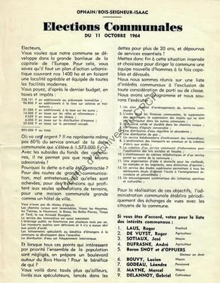 Imprimé électoral de la liste PSC de la commune de Ophain-Bois-Seigneur-Isaac à destination des pensionnés et réalisé à l'occasion des élections communales du 11 octobre 1964.