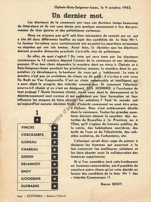 Imprimé électoral de la liste PSC de la commune de Ophain-Bois-Seigneur-Isaac réalisé à l'occasion des élections communales du 12 octobre 1952.