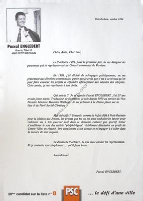 Imprimé électoral du candidat PSC Pascal Englebert réalisé à l'occasion des élections communales du 9 octobre 1994.