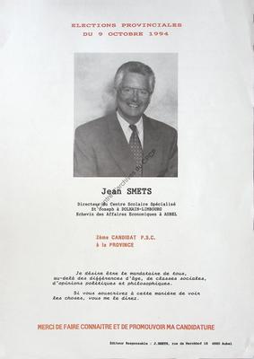 Imprimé électoral du candidat PSC Jean Smets réalisé à l'occasion des élections provinciales du 9 octobre 1994.