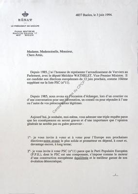 Imprimé électoral du sénateur PSC Pierre Wintgens réalisé à l'occasion des élections européennes du 12 juin 1994.
