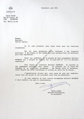 Imprimé électoral du sénateur PSC Amand Dalem en faveur du Ministre PSC Melchior Wathelet réalisé à l'occasion des élections européennes du 12 juin 1994.