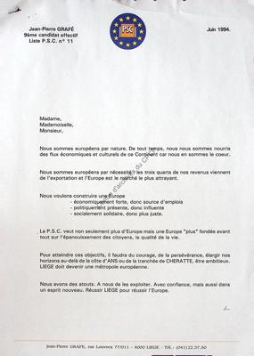 Imprimé électoral du Ministre PSC Jean-Pierre Grafé réalisé à l'occasion des élections européennes du 12 juin 1994.