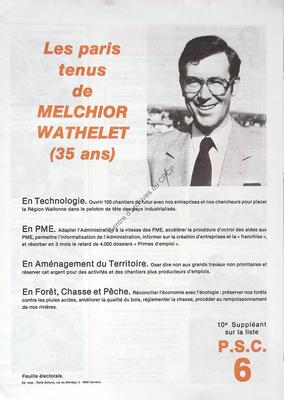 Imprimé électoral du Ministre PSC Melchior Wathelet réalisé dans le cadre des élections européennes du 17 juin 1984.