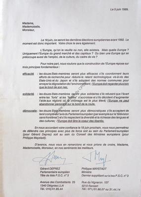 Imprimé électoral du Ministre PSC Philippe Maystadt et du président du PSC Gérard Deprez réalisé à l'occasion des élections européennes du 18 juin 1989.