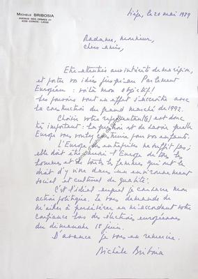 Imprimé électoral de la députée européenne PSC Michèle Bribosia réalisé à l'occasion des élections européennes du 18 juin 1989.