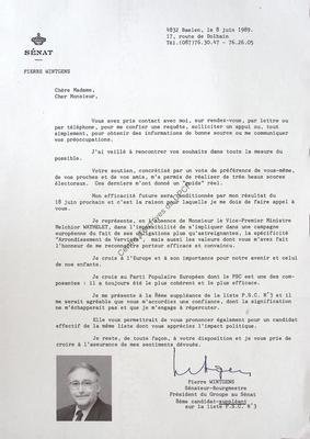 Imprimé électoral du sénateur PSC Pierre Wintgens réalisé à l'occasion des élections européennes du 18 juin 1989.