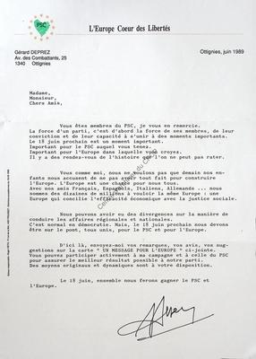 Imprimé électoral du président du PSC Gérard Deprez réalisé à l'occasion des élections européennes du 18 juin 1989.