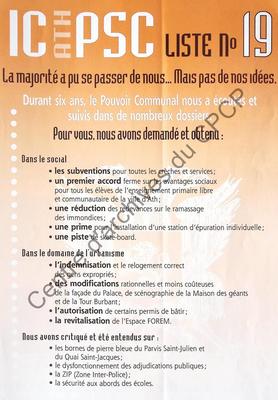 Imprimé électoral des candidats de la liste IC-PSC d'Ath réalisé à l'occasion des élections communales et provinciales du 8 octobre 2000.