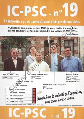Imprimé électoral des candidats de la liste IC-PSC de Ghislenghien réalisé à l'occasion des élections communales et provinciales du 8 octobre 2000.