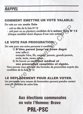 Imprimé électoral de la liste PSC-PRL de Beloeil réalisé à l'occasion des élections communales du 9 octobre 1988.