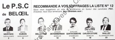 Imprimé électoral de la liste PSC de Beloeil réalisé à l'occasion des élections communales du 9 octobre 1988.
