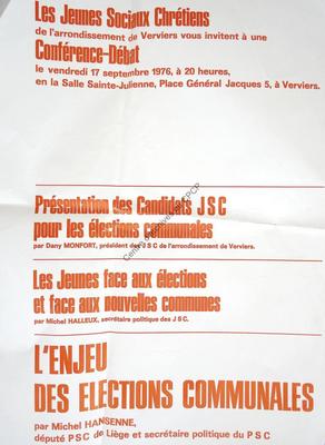 Affiche réalisée par les Jeunes Sociaux Chrétiens de l'arrondissement de Verviers dans le cadre de l'organisation d'une conférence-débat le 17 septembre 1976 sur l'enjeux des élections communales en présence notamment du député PSC Michel Hansenne.