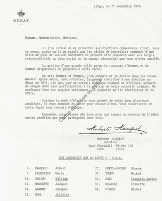 Imprimé électoral de la sénatrice PSC Huberte Hanquet réalisé à l'occasion des élections communales du 10 octobre 1976.
