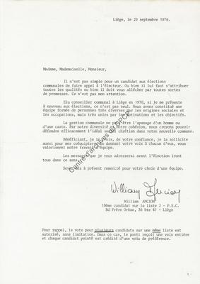 Imprimé électoral de l'échevin PSC liégeois William Ancion réalisé à l'occasion des élections communales du 10 octobre 1976.
