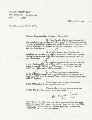 Imprimé électoral de la candidate PSC Antoinette Begasse-Kraft réalisé à l'occasion des élections communales du 10 octobre 1976.