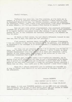 Imprimé électoral du candidat PSC Jacques Marneffe à destination du milieu de l'enseignement et réalisé à l'occasion des élections communales du 10 octobre 1976.