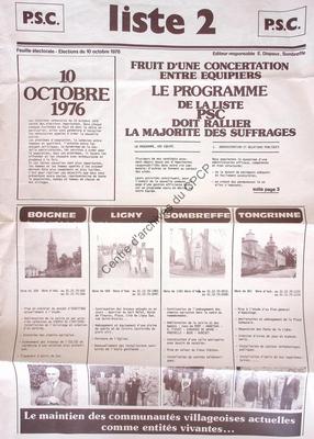 Imprimé électoral du PSC de Sombreffe réalisé à l'occasion des élections communales du 10 octobre 1976.