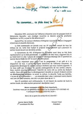 Imprimé électoral du PSC d'Ottignies-Louvain-la-Neuve réalisé à l'occasion des élections communales et provinciales du 8 octobre 2000.