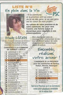 Imprimé électoral de la candidate PSC de Durbuy Marie Lizen réalisé à l'occasion des élections communales et provinciales du 8 octobre 2000.