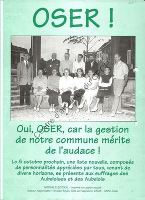 Imprimé électoral de la liste Oser (tendance PSC) de Aubel réalisé à l'occasion des élections communales et provinciales du 8 octobre 2000.