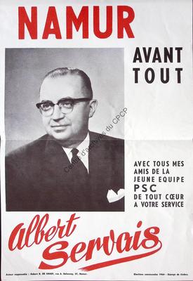 Affiche électorale du député PSC de Namur Albert Servais réalisée dans le cadre des élections communales du 11 octobre 1964.