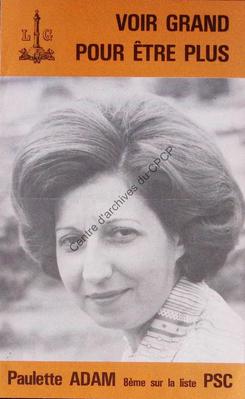 Imprimé électoral de la candidate PSC de Liège Paulette Adam réalisé à l'occasion des élections communales du 10 octobre 1976.
