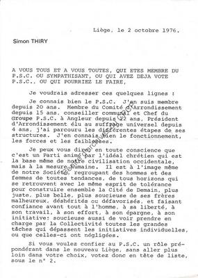 Imprimé électoral du candidat PSC de Liège Simon Thiry réalisé à l'occasion des élections communales du 10 octobre 1976.