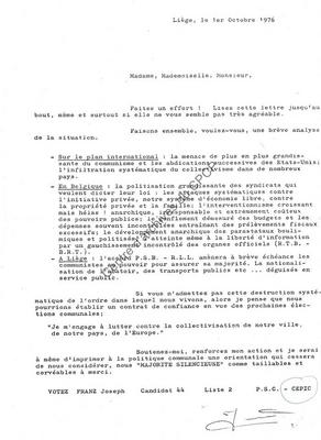 Imprimé électoral du candidat PSC-CEPIC de Liège Joseph Franz réalisé à l'occasion des élections communales du 10 octobre 1976.