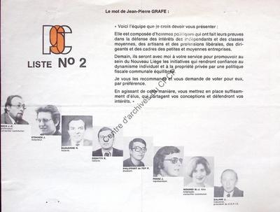Imprimé électoral de la liste PSC, avec précision des candidats CEPIC, de Liège réalisé à l'occasion des élections communales du 10 octobre 1976.
