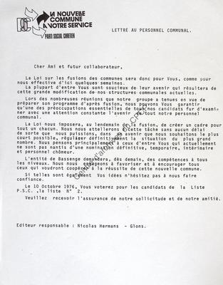 Imprimé électoral du PSC de Bassenge adressé au personnel communal réalisé à l'occasion des élections communales du 10 octobre 1976.