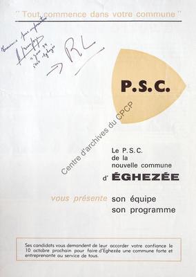 Imprimé électoral du PSC de Eghezée réalisé à l'occasion des élections communales du 10 octobre 1976.
