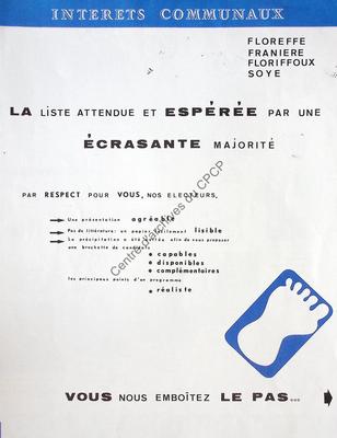 Imprimé électoral de la liste Intérêts Communaux (tendance PSC-PRL) de Floreffe réalisé à l'occasion des élections communales du 10 octobre 1976.