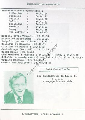 Imprimé électoral du candidat PSC Jean-Claude Gois réalisé à l'occasion des élections communales du 10 octobre 1976 à Brunehaut.