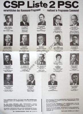 Imprimé électoral de la liste PSC-CSP de La Calamine réalisé à l'occasion des élections communales du 10 octobre 1976.