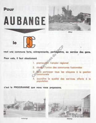 Imprimé électoral de la liste PSC de Aubange réalisé à l'occasion des élections communales du 10 octobre 1976.