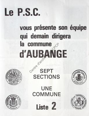 Imprimé électoral de la liste PSC de Aubange réalisé à l'occasion des élections communales du 10 octobre 1976.