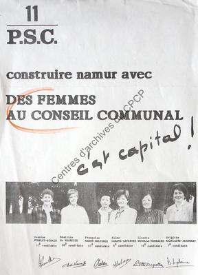 Imprimé électoral de candidates PSC réalisé à l'occasion des élections communales du 9 octobre 1988 à Namur.