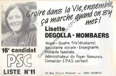 Imprimé électoral de la candidate PSC Lisette Degolla réalisé à l'occasion des élections communales du 9 octobre 1988 à Namur.
