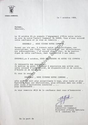 Imprimé électoral du candidate PSC Michel Goffinet réalisé à l'occasion des élections communales du 9 octobre 1988 à Namur.