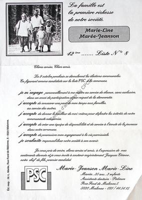 Imprimé électoral de la candidate PSC Marie-Line Marée-Jeanson réalisé à l'occasion des élections communales du 9 octobre 1994.