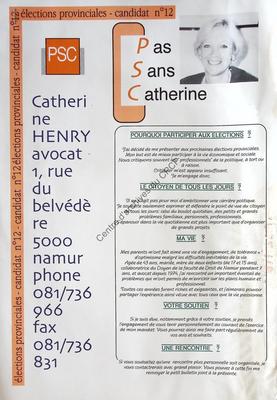 Imprimé électoral de la candidate PSC Catherine Henry réalisé à l'occasion des élections communales du 9 octobre 1994 à Namur.