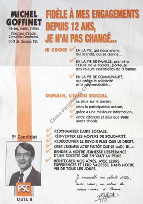Imprimé électoral du candidat PSC Michel Goffinet réalisé à l'occasion des élections communales du 9 octobre 1994 à Namur.