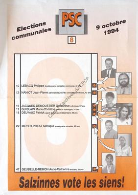 Imprimé électoral des candidats PSC de Salzinnes réalisé à l'occasion des élections communales du 9 octobre 1994 à Namur.